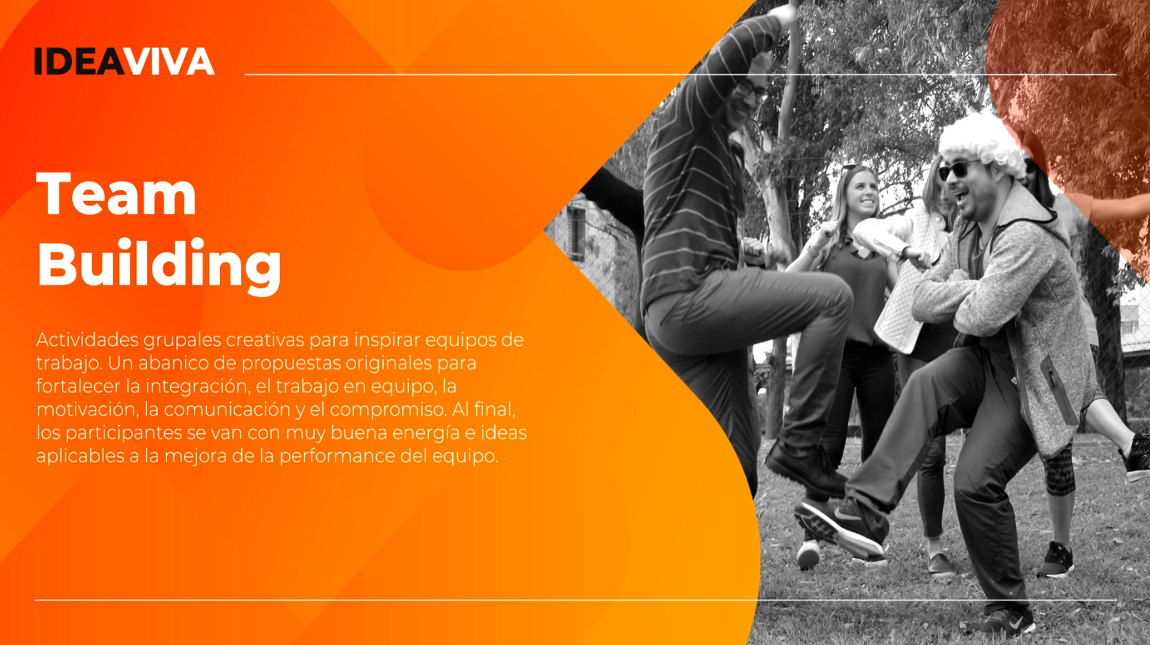 - Un combo de actividades lúdico-creativas originales a elección, incluyendo rompehielos, juegos semi-deportivos, juegos de ingenio, competencias en equipo, desafíos creativos con contenidos a medida, espacios de reflexión grupal, espacios para la generación creativa de ideas y mensajes alineados a los objetivos de la compañía.